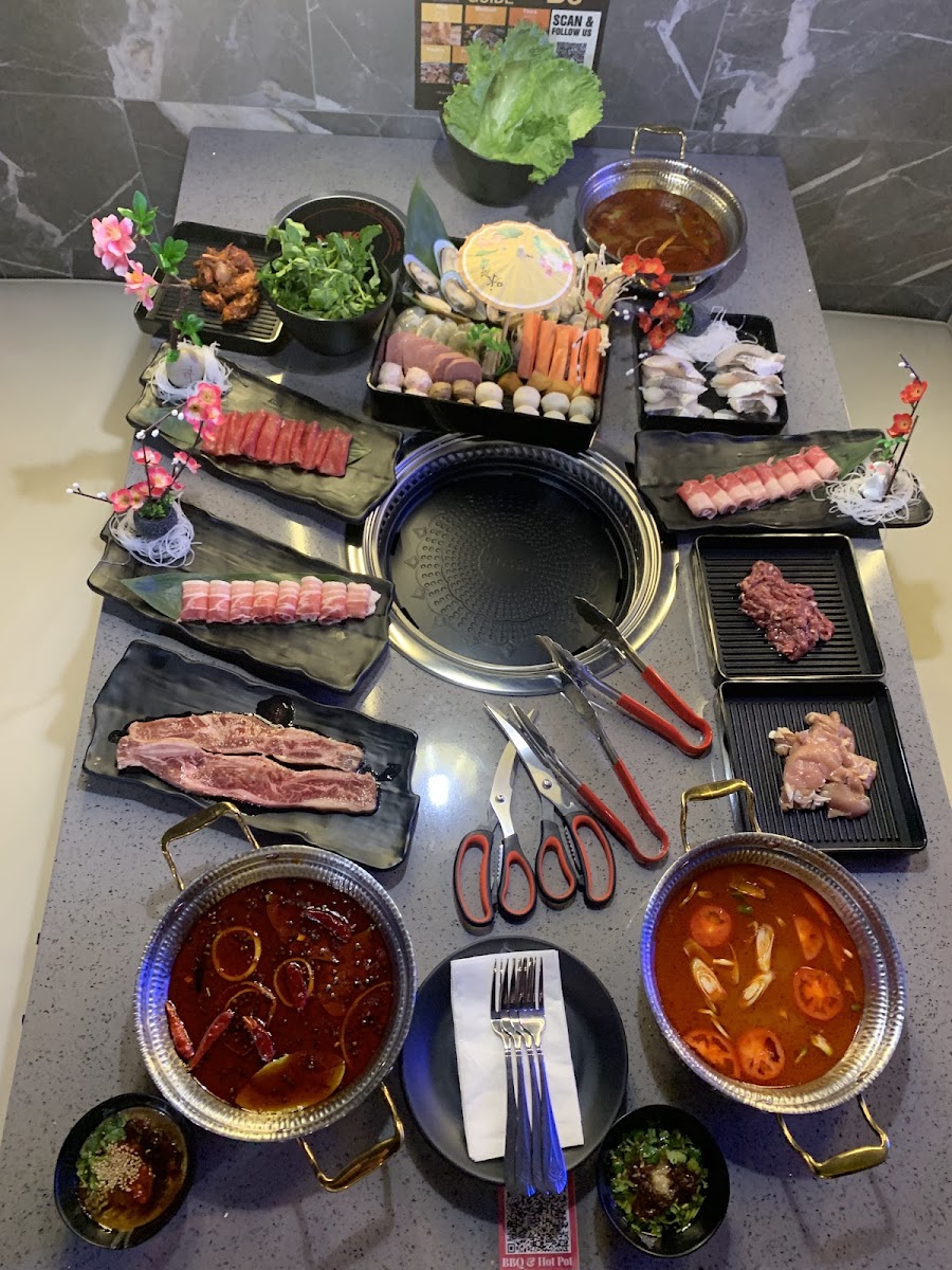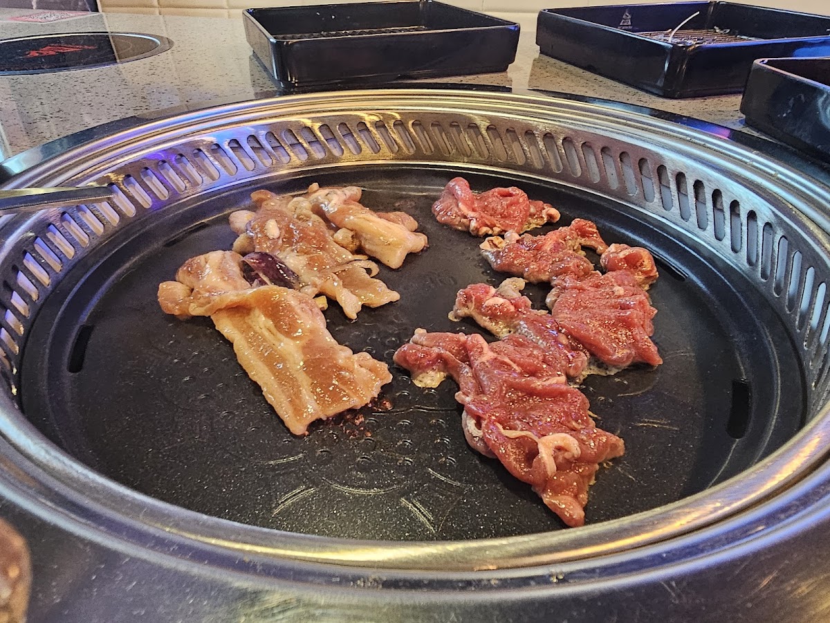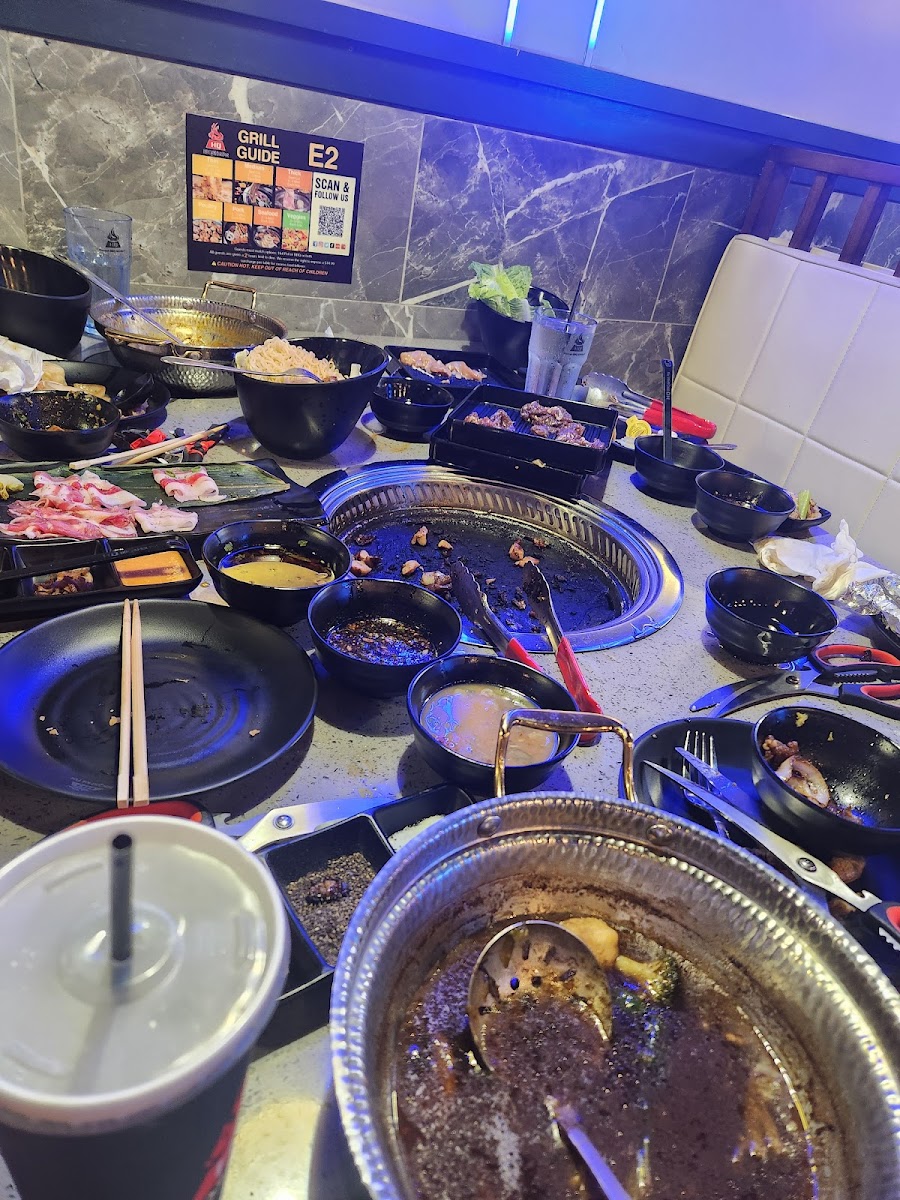 If you’re new to this style of dining, the process is simple. Pick your proteins, choose between spicy or mild broth, then grill or simmer right at your table. The staff rotates through the dining room offering tips, wiping down grills, and swapping pans before anything burns. It’s casual but impressively organized, especially during peak weekend hours.